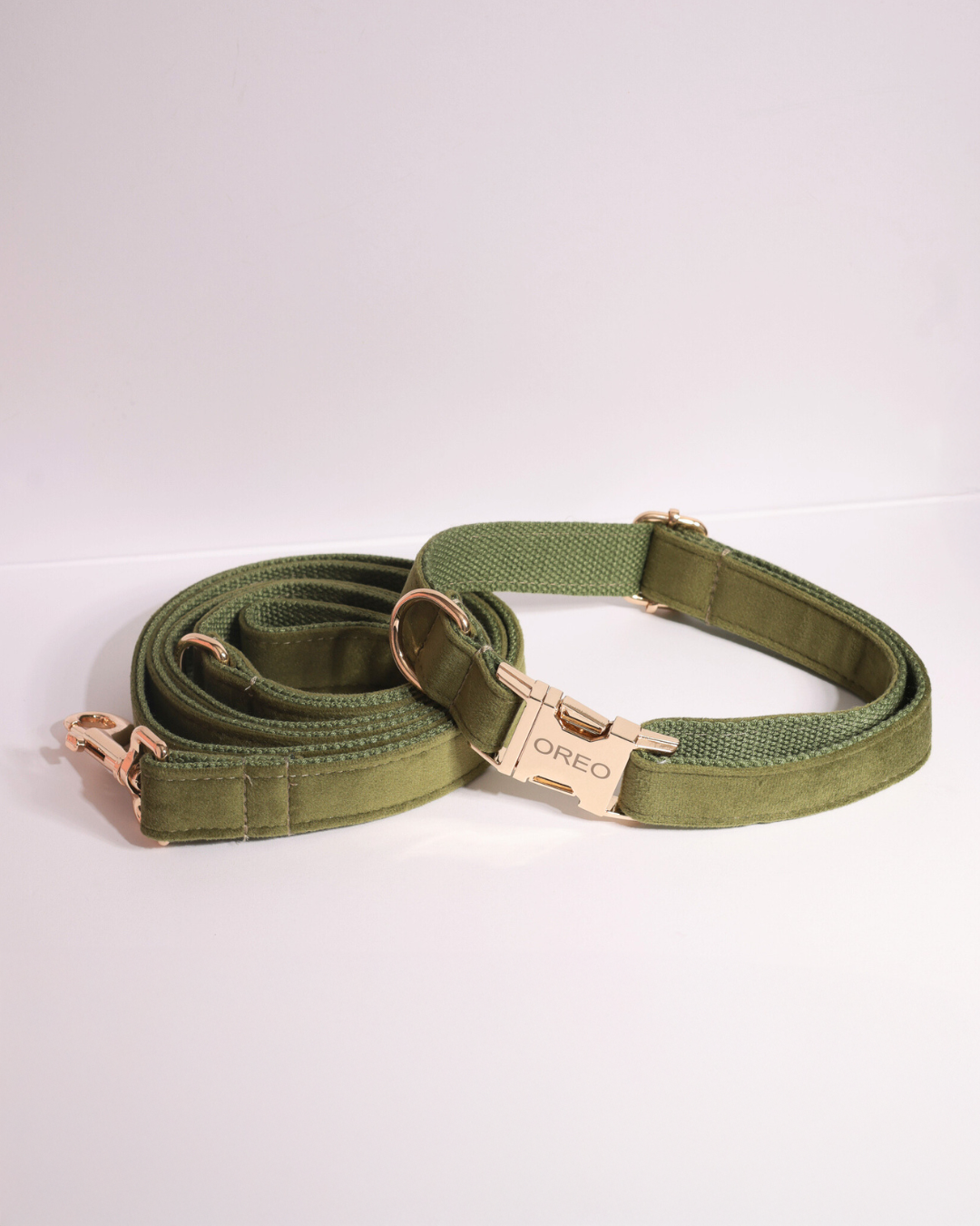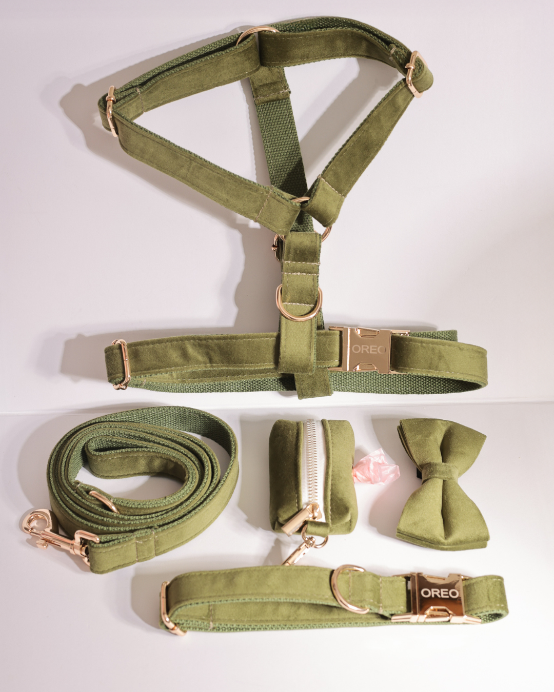 Im Set enthalten sind ein personalisiertes Halsband, eine farblich passende Leine, ein bequemes Geschirr, eine dekorative Schleife sowie ein Poop Bag Spender – alles im edlen Samt-Finish mit stabiler Gewebe-Innenseite und goldfarbenen Metallverschlüssen.