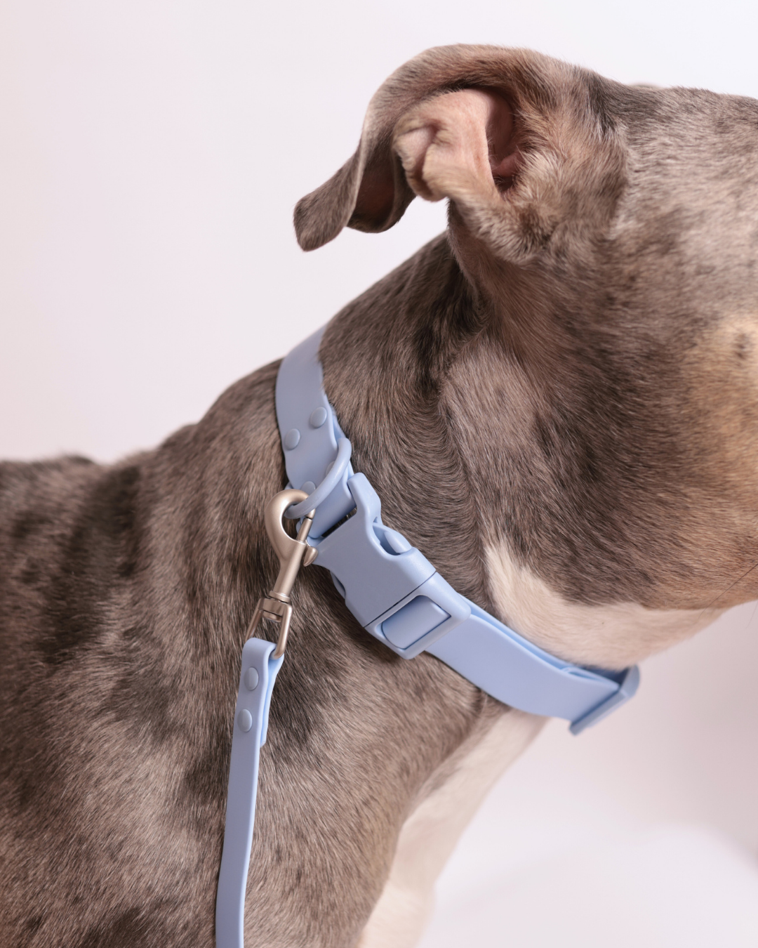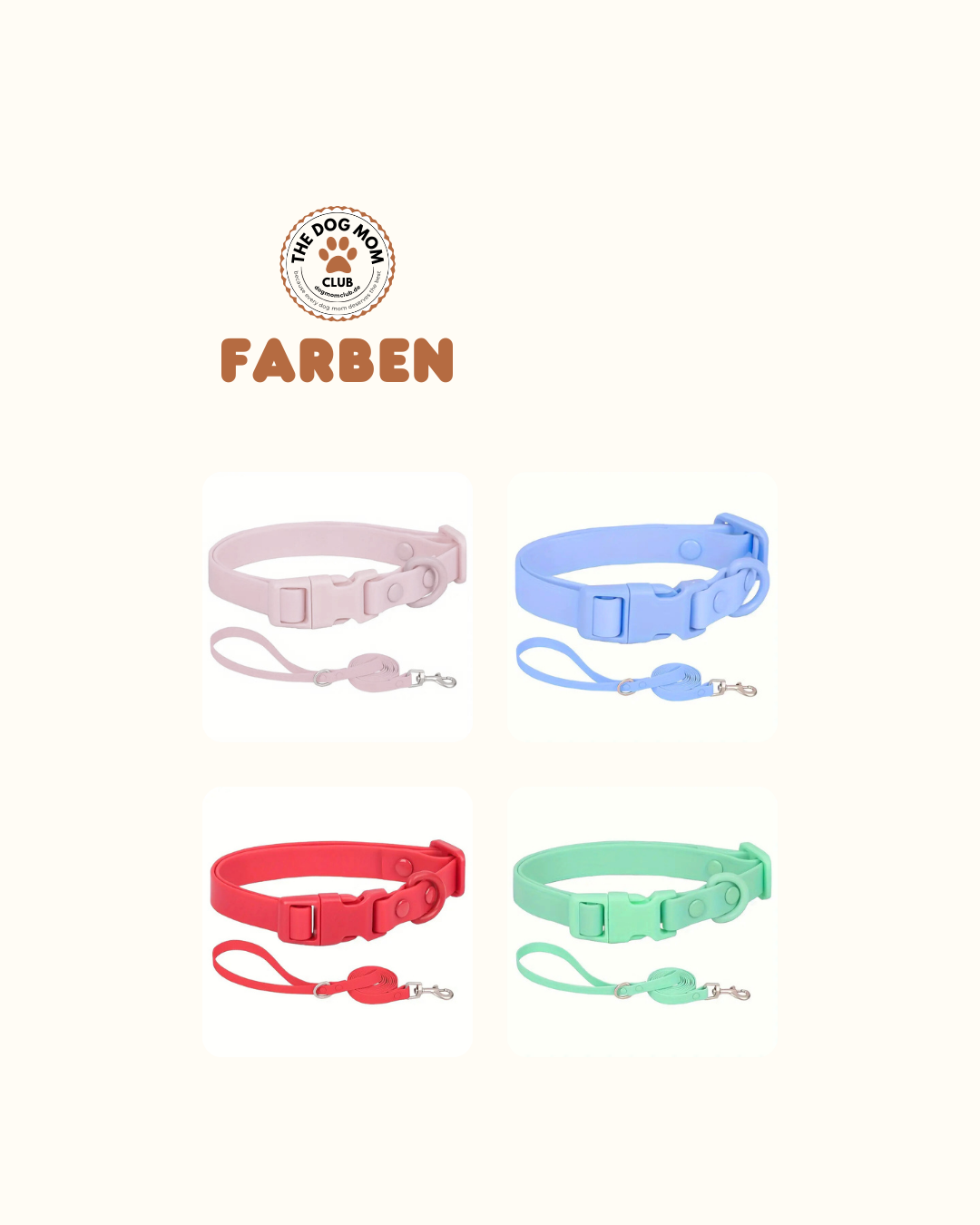 Das Set besteht aus einem robusten Halsband mit gummierter Halterung und einer 150 cm langen Leine – gefertigt aus hochwertigem, wasserfestem PVC-Material mit gewebtem Kern. Dieses Material ist besonders strapazierfähig, pflegeleicht und ideal für aktive Hunde.